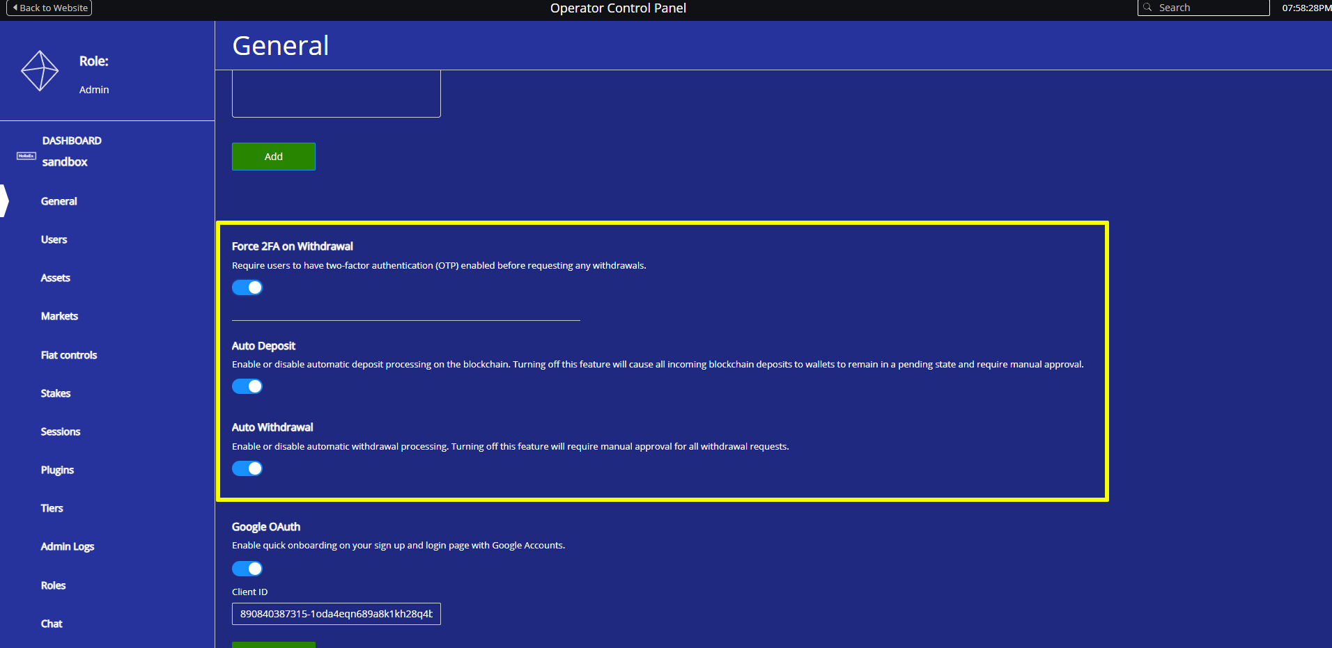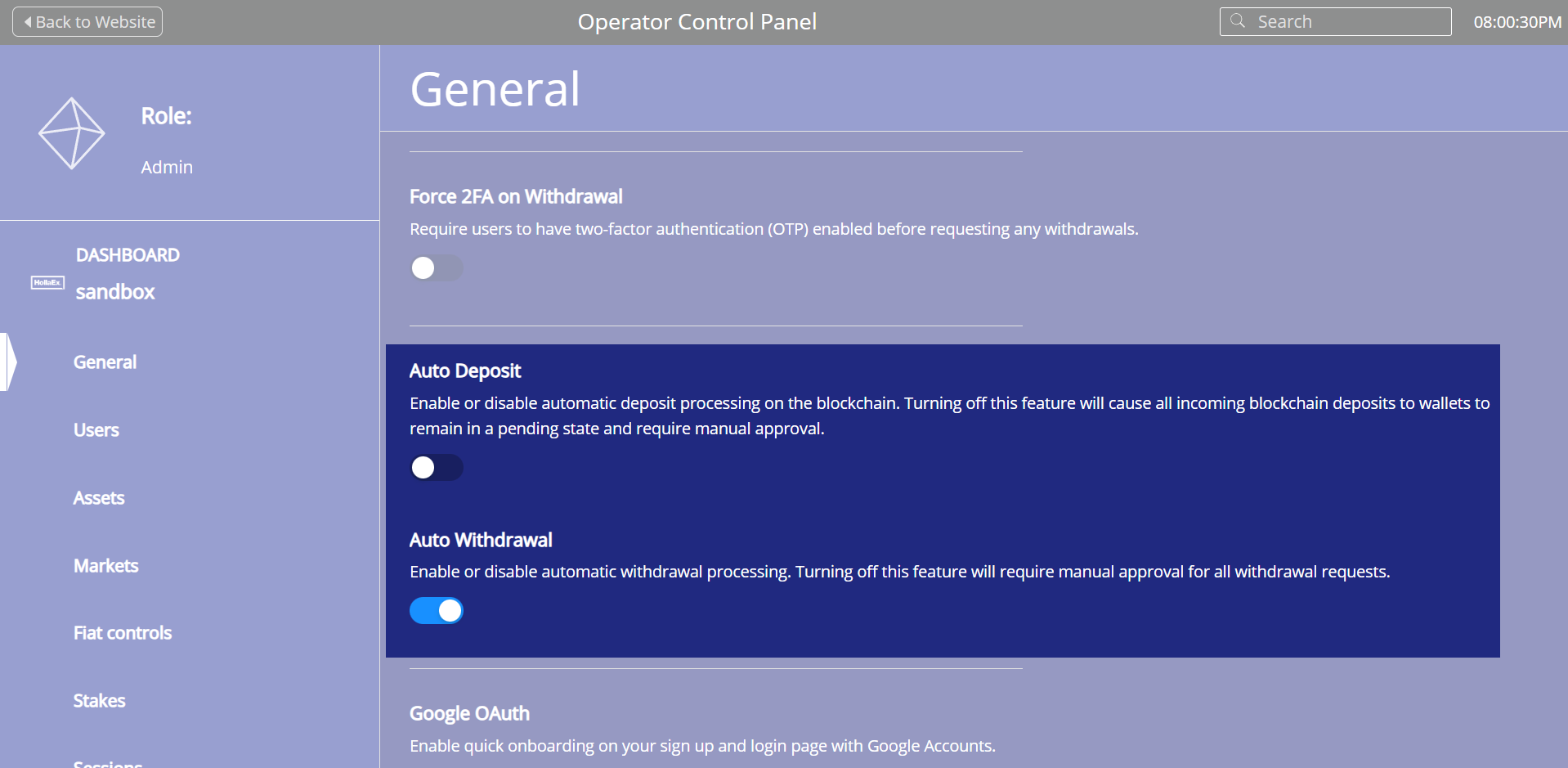 Toggle for auto deposit and withdrawal options now available to admin in v2.17 that allows for greater control over what comes in and out of the platform