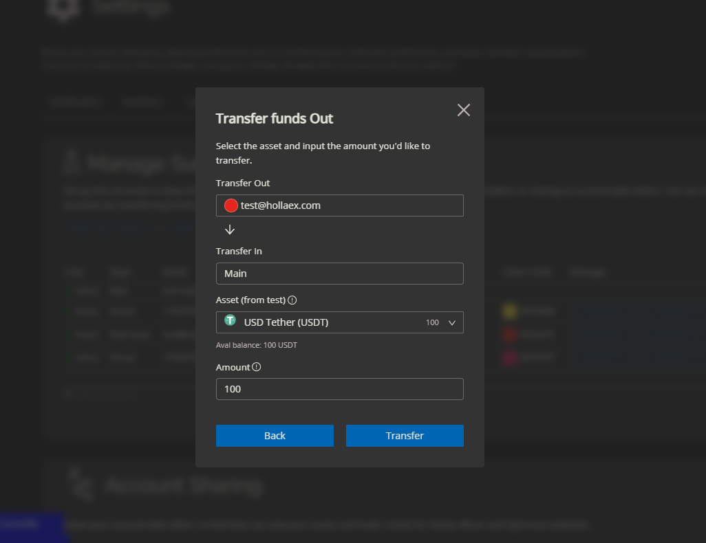 In order to withdraw funds of the sub account, the main account holder must use the 'Transfer Out' functions within the Sub Account page while using the Main Account