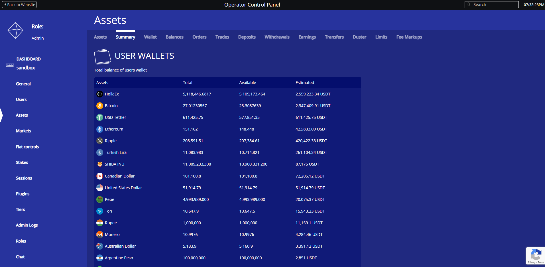 Wallet admin view example screenshot show the wide range of HollaeEx's blockchains network support and various altcoins.