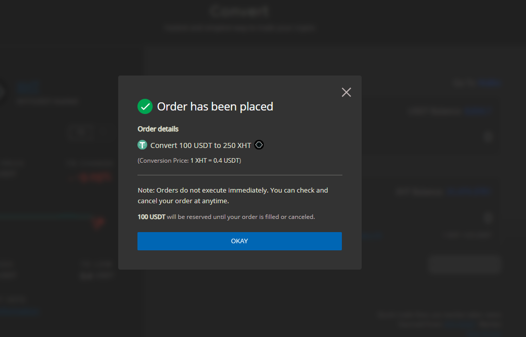 Waiting limit orders below on the Quick Trade Convert page. User can review, cancel and manage their orders here.