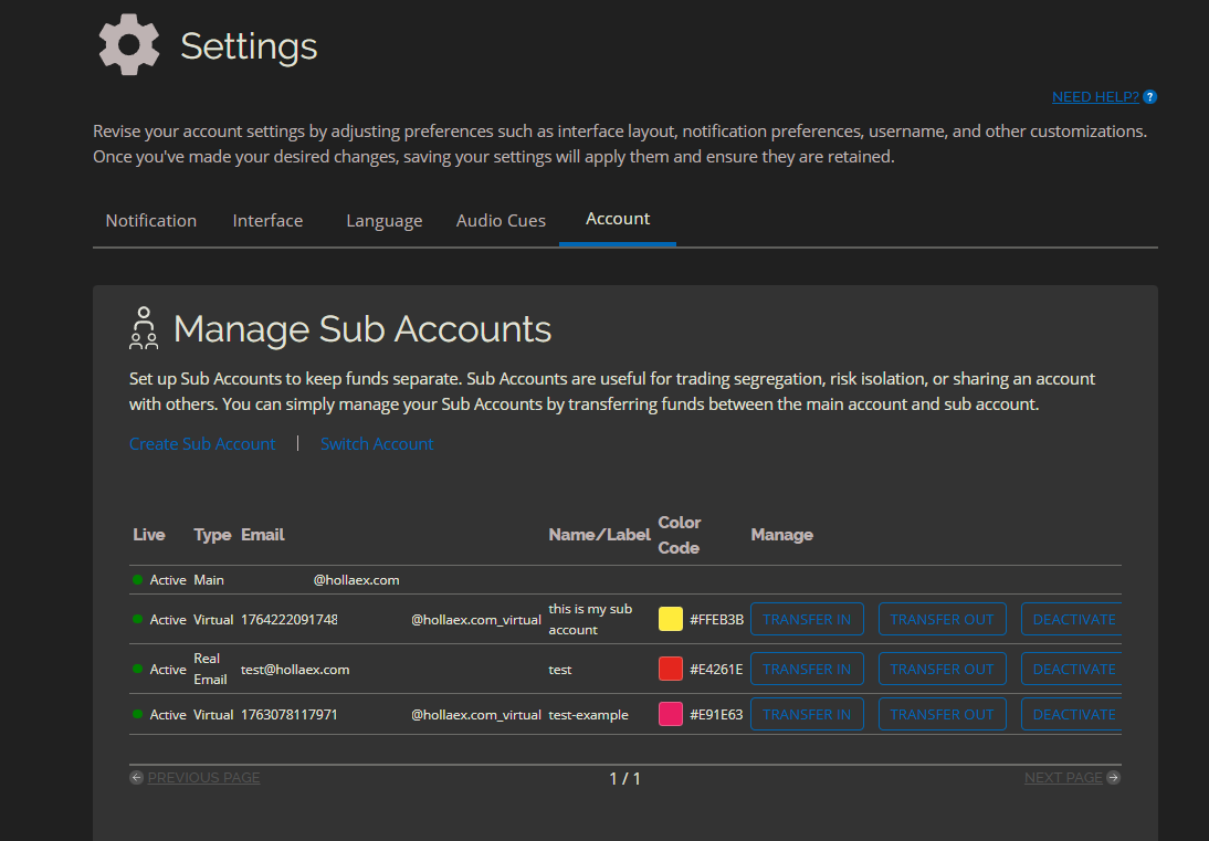 Each sub account can be used for separate strategies or business lines (e.g., treasury, trading desk, client funds, internal testing, future margin trading).
